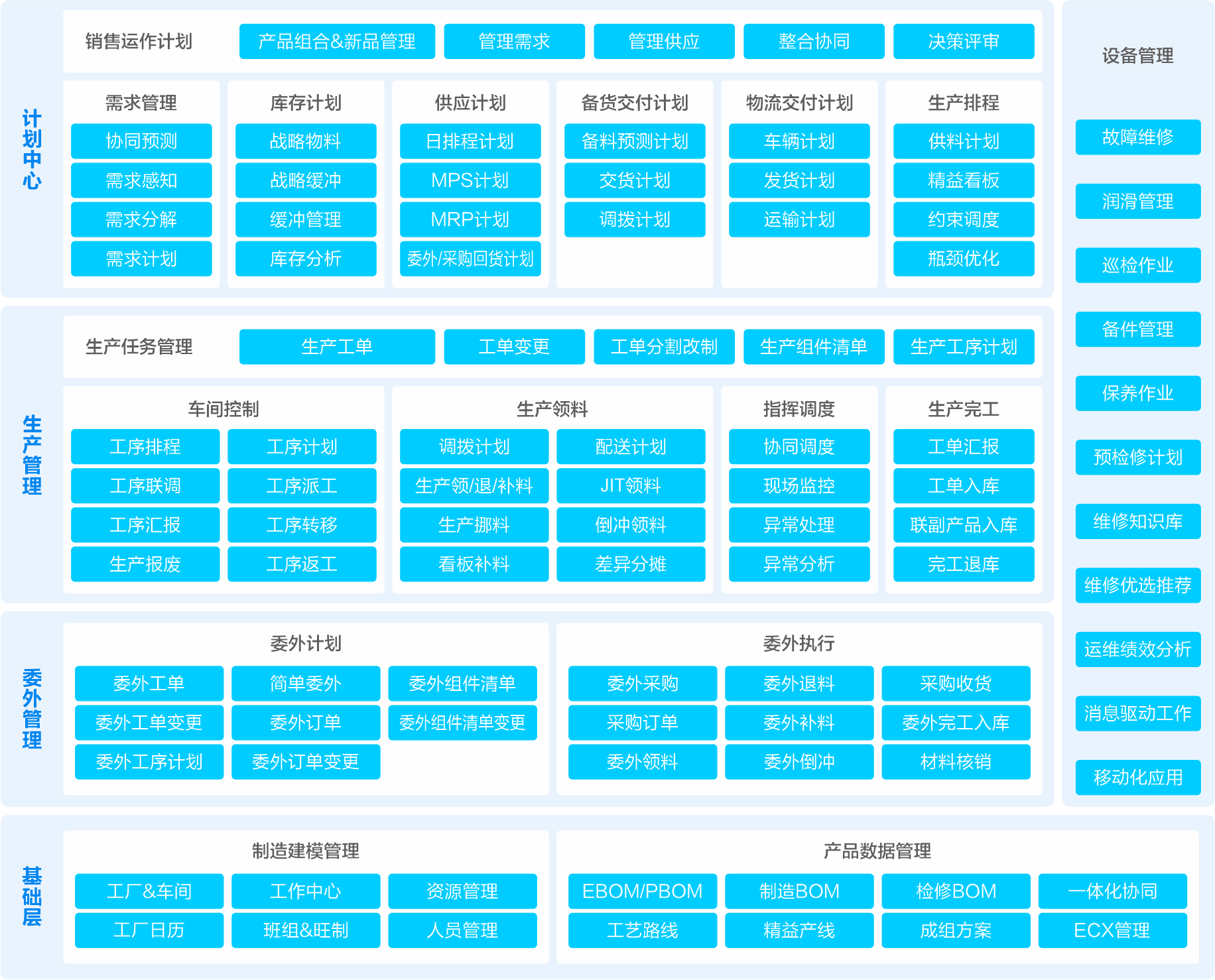 基于客户协同、供应商协同、研发管理、供应链管理、制造运营等平台,助力企业研产供销端到端的内外协同与管理提升;基于财务管理、项目管理、人力资源、运营决策等平台,助力企业运营管控效能提升,以提升需求响应与协同交付、数智运营、集团管控等核心竞争能力