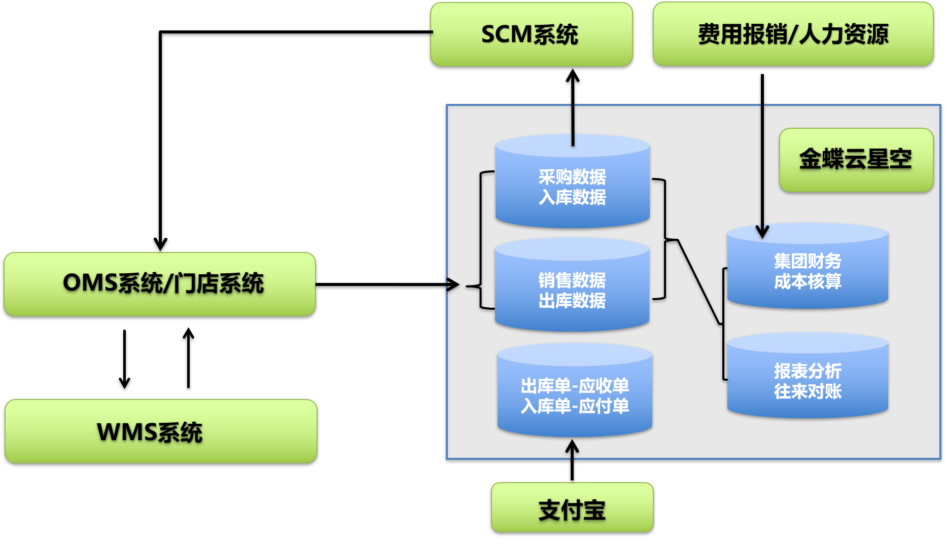 通过多系统集成方案,实现采购、仓储、销售、物流、财务等管理模块无缝集成管理,将SCM、OMS、WMS及其他业务系统的订单数据、出入库单据传递至金蝶云星空作为财务核算的依据,最终生成财务凭证,覆盖整个业务线的全过程,实现线上、线下一体化管理,打破业务与财务的数据孤岛,企业真正实现业财一体化。