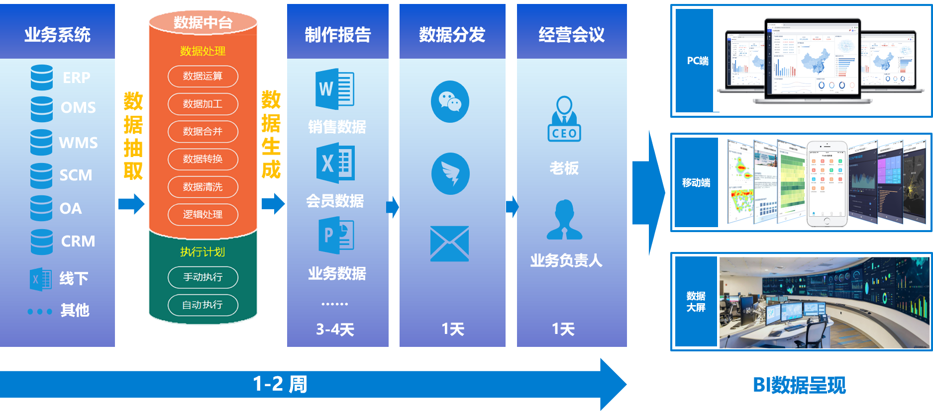 从金蝶、OMS、WMS、SCM等业务系统及数据文件抽取数据经过数据中台的清洗加工生成各类业务数据报告并生成数据看版,数据报告可通过微信、钉钉、邮件等方式发送至领导或公共平台,从相互独立的数据形成了统一的数据管理平台,提高获取数据的效率,提升辅助洞察决策的数据参考。