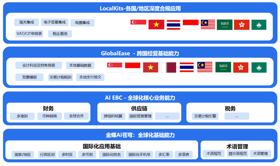 进入新市场,安全合规是第一道门槛。Kingdee AI Suite的LocalKits本地化包,通过财税包与关务包深化本地服务能力:
