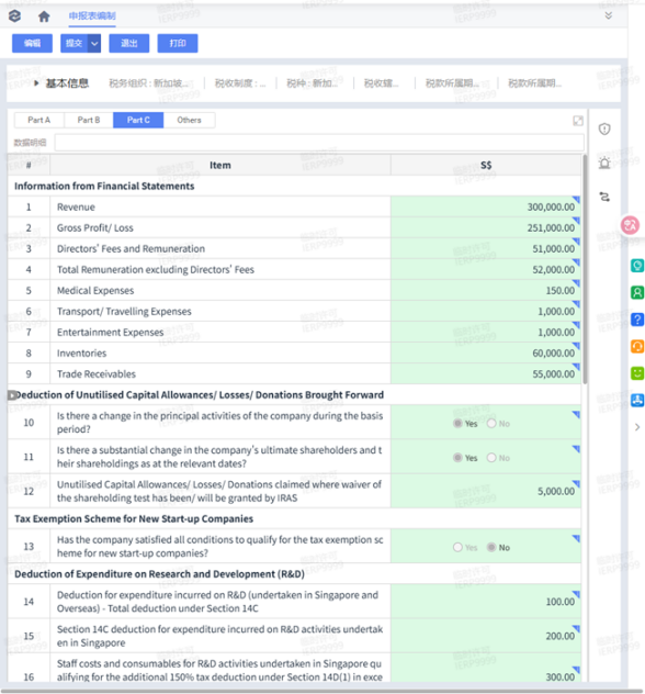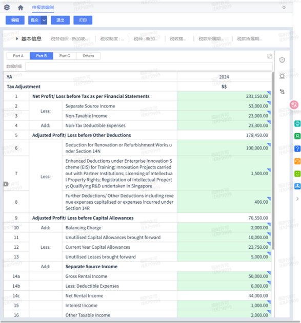 金蝶AI星空已满足IRAS官方 Accounting Software Register Plus(ASR+)认证技术要求,并对齐推荐的数字化能力框架。在交易环节,系统自动获取业务单据中的交易发生地、业务产品与税务资质等关键信息,自动完成税务判定,实现税种、税率、税额等关键要素的自动化计算,为期末申报提供 GST 申报表同源数据。在CIT申报环节,根据取数配置自动进行CIT计税,提供CIT年度申报表(Form C-S)编制与审核、导出等能力。通过规则固化与过程留痕,帮助企业减少手工汇总与反复核对,显著降低合规申报成本。